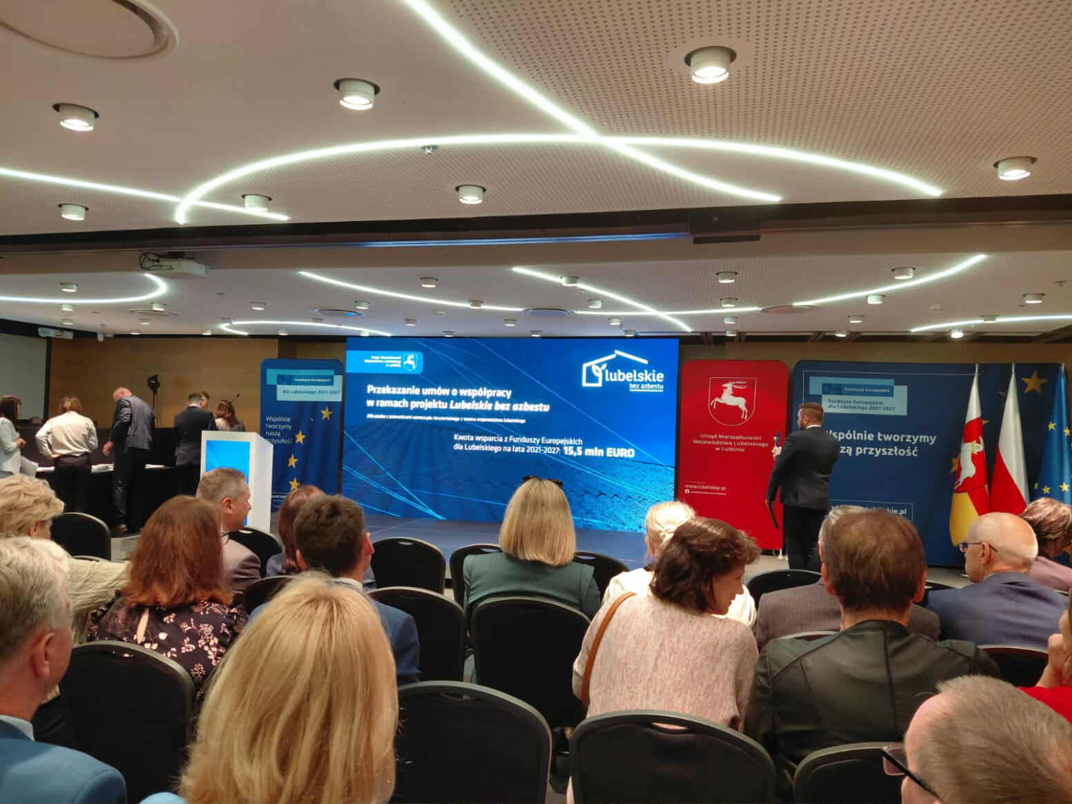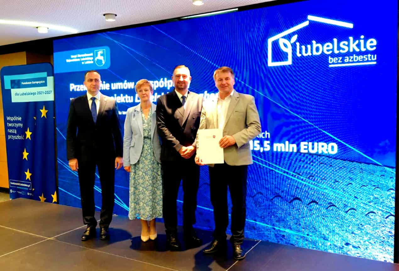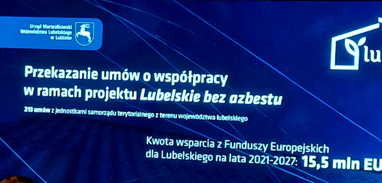 W minionym tygodniu w Lubelskim Centrum Konferencyjnym Urzędu Marszałkowskiego wójt Dariusz Stocki przy kontrasygnacie skarbnik gminy Ireny Jagiełło podpisał umowę potwierdzającą przystąpienie Gminy Kamień do projektu „Lubelskie bez azbestu”.