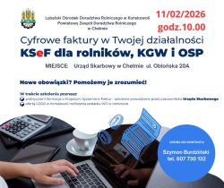 Lubelski Ośrodek Doradztwa Rolniczego w Końskowoli Powiatowy Zespół Doradztwa Rolniczego w Chełmie zaprasza na szkolenie Cyfrowe faktury FSeF w twojej działalności dla rolników, KGW, OSP, które odbędzie się 11 lutego godz. 10.00 w urzędzie Skarbowym w Chełmie ul. Obłońska 20A.