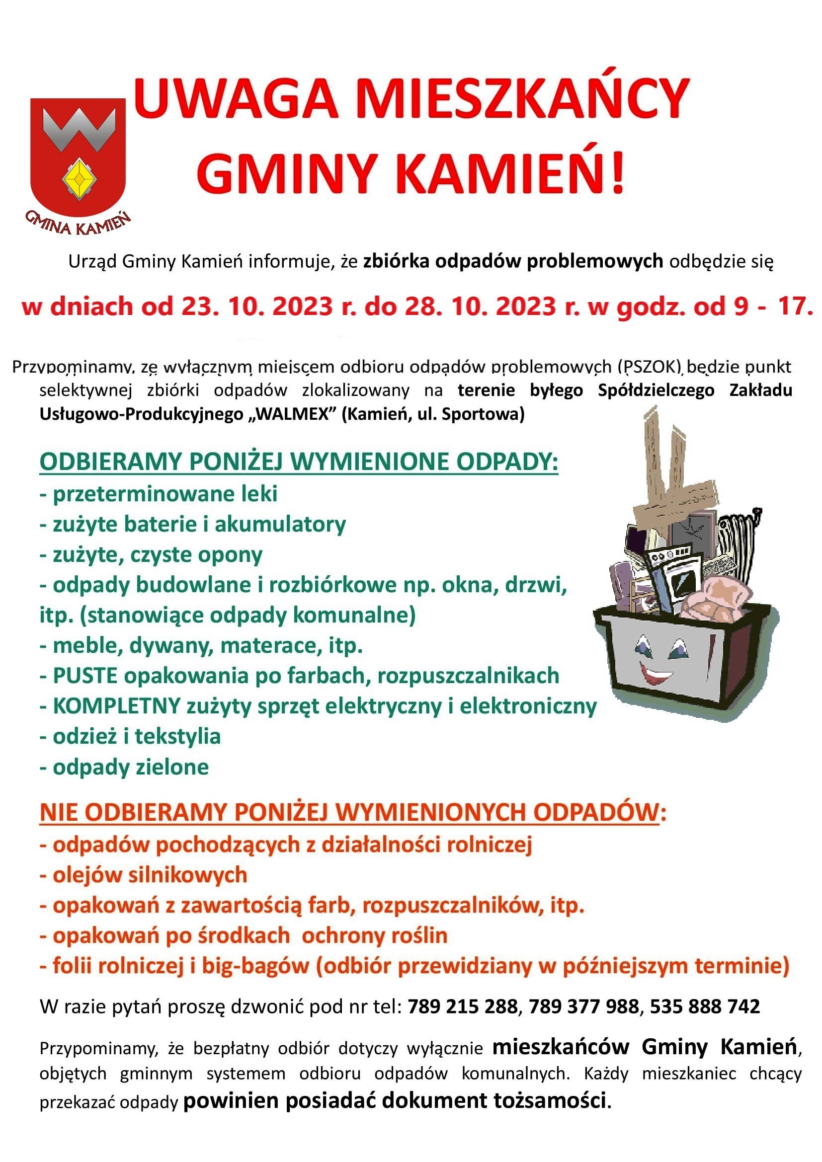 • Zbiórka odpadów problemowych w dniach 23 -28 października 2023 r. w godz. 9-17